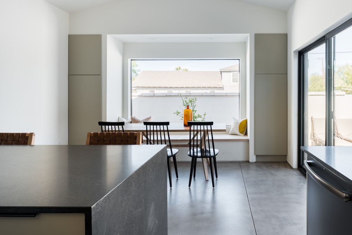 This home was renovated by a professional designer (@designxwoods) and showcases unique details and inspiring finishes around every corner! Soak in the natural light in the airy and open living space wrapped in white brick and even venture up the ladder to the loft for a meditate moment. From the retro furnishings and oak hardwood floors to the spa-like bathrooms, the home is warm and charming and filled with amenities to make your stay comfortable. It is perfect for larger groups or families wanting a cozy stay near the best restaurants and shops Phoenix has to offer. The brick paved back patio offers a great al fresco dining option with the beautiful Arizona sunsets. Disclaimer: For your safety of our property and our guests, one surveillance camera has been installed on the front porch. Guests have access to the entire home, including back patio. PLEASE NOTE: The loft is accessed via a steel ladder that is secured to the wall. We ask that guests use ladder carefully and at their own risk. We are always available via telephone or through the app. The house is in the Coronado Historic District, a quiet residential community of young families and artists. Several restaurants and coffee shops are within walking distance. Downtown Phoenix is a 5-minute drive away. Guests are welcome to park on the gravel driveway, two cars can fit tandem. We have a two car maximum at the property. PLEASE NOTE: The listing photos were taken before the window treatments were installed. The master bedroom currently has a blackout drapery panel. The guest bedrooms have blackout roller shades and the living room windows have privacy roller shades.