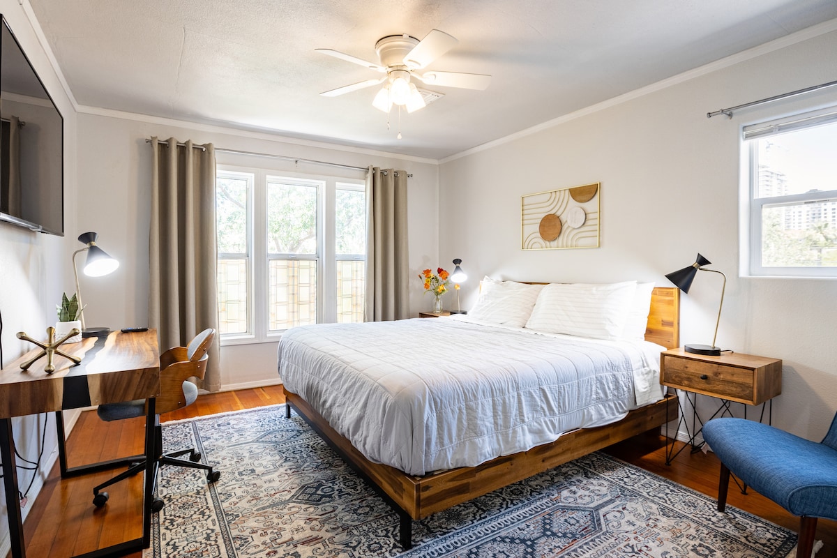 Enjoy a good night's rest on a comfy king-size bed, and easy access to everything from this perfectly located home base just a few blocks from downtown Phoenix. This well-designed space is both functional and comfortable whether you're coming for the next weekend game, or setting up a welcoming home away from home during an extended trip for work or school. Features free off street parking; walking, biking, scooter distance to downtown; and all the amenities of home.