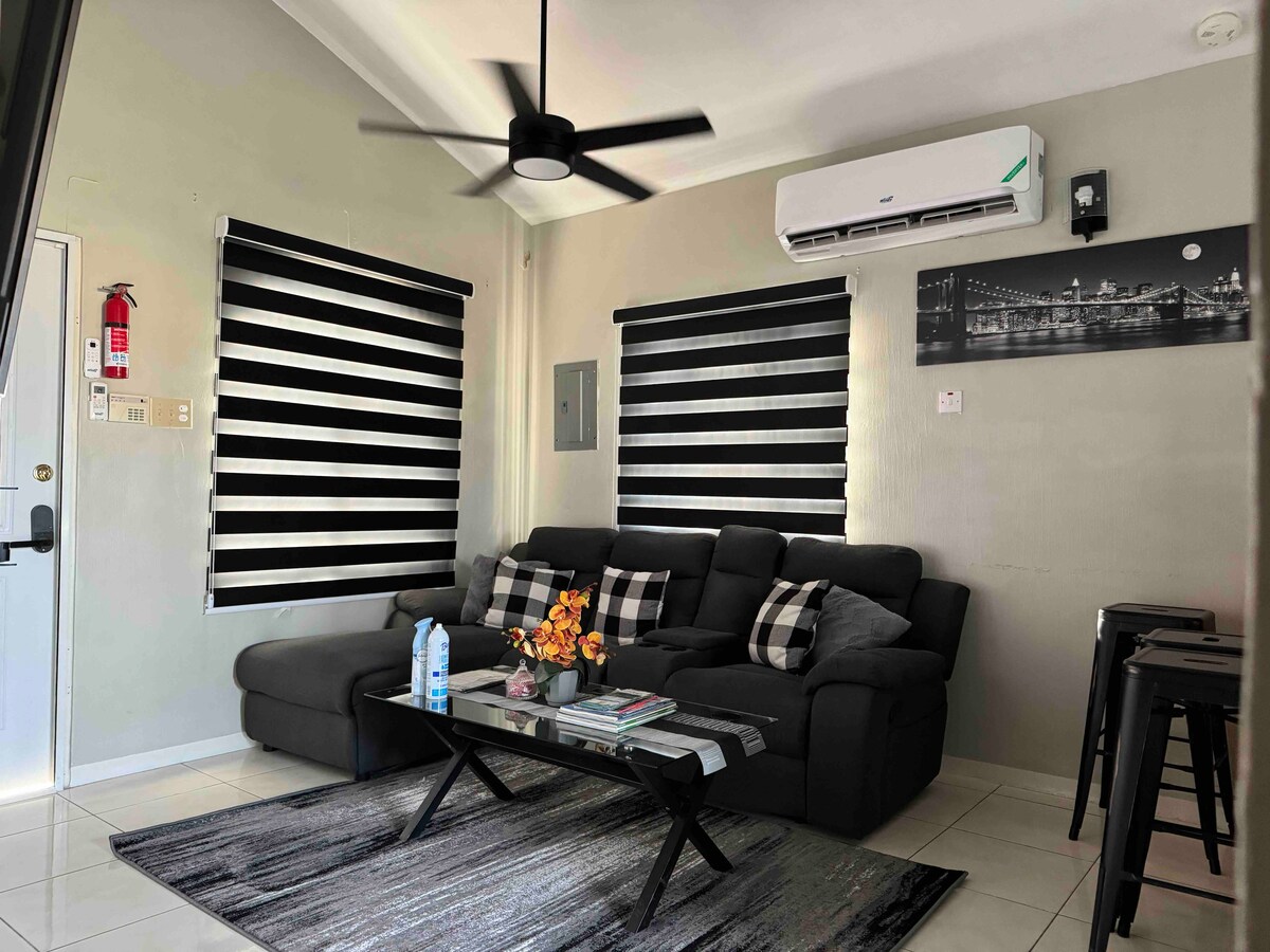 Our house consist of a furnished 1 bedroom with AC and an ensuite bathroom, water heater, open concept living and dining rooms, kitchen fully air condition. Wireless internet and HD Smart TV with cable. The community is newly built and boasted amenities such as a kiddies playground, football field, a multipurpose court, jogging trail and gazebos. The property is in close proximity to Restaurants, Sovereign Shopping Mall, Hung Way Shopping Mall, Pharmacies, Movie Theatre, Banks, Beaches .