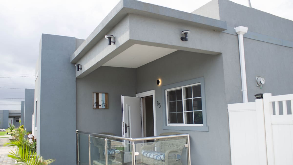 Modern 2 bedroom 1 bathroom home, made and customized for your own peaceful ,relaxation in a quite gated community. The bedrooms are equipped with television with access to netflix , wi-fi ,air conditioning unit and ceiling fan in each room.The home also comes with its own washing machine and barbecue grill. Self light stove and ice 🧊 maker refrigerator. Bedside lamps with phone chargers 🔌 and alarm ⏰ to wake you up.