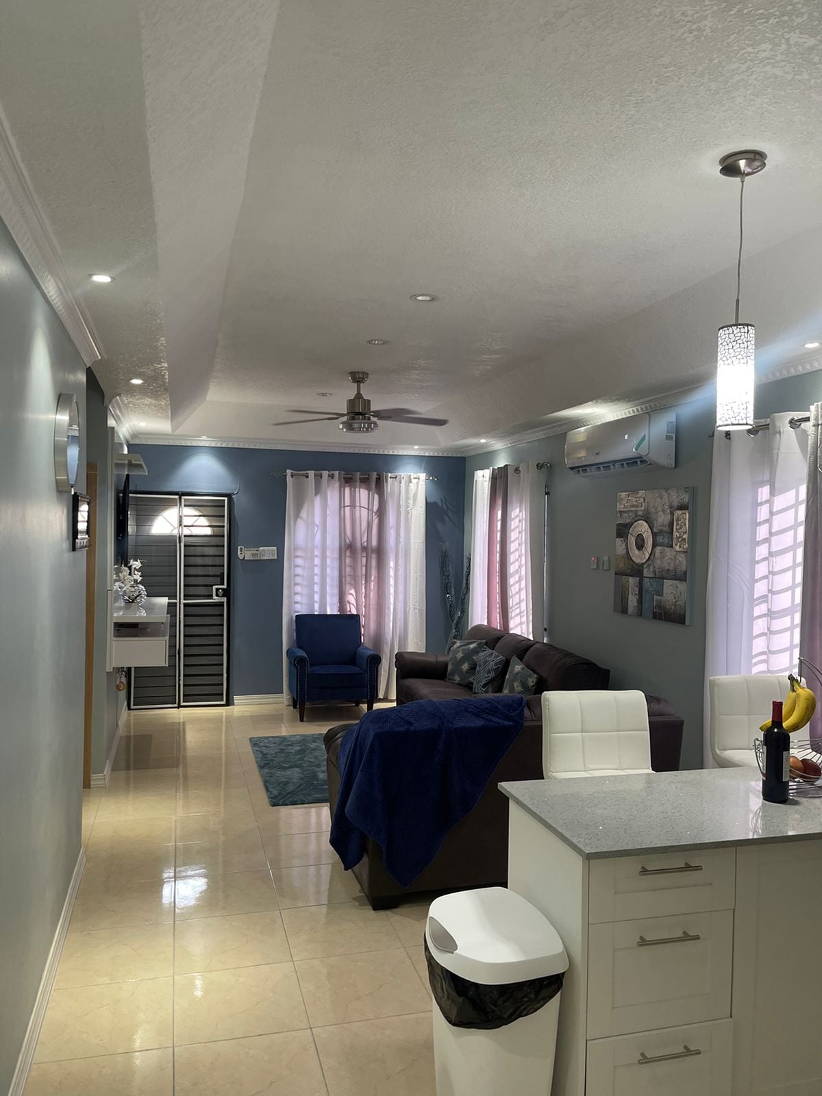 Our house consist of a furnished 1 bedroom with AC and an ensuite bathroom, water heater, open concept living and dining rooms, kitchen fully air condition. Wireless internet and HD Smart TV with cable. The community is newly built and boasted amenities such as a kiddies playground, football field, a multipurpose court, jogging trail and gazebos. The property is in close proximity to Restaurants, Sovereign Shopping Mall, Hung Way Shopping Mall, Pharmacies, Movie Theatre, Banks, Beaches .