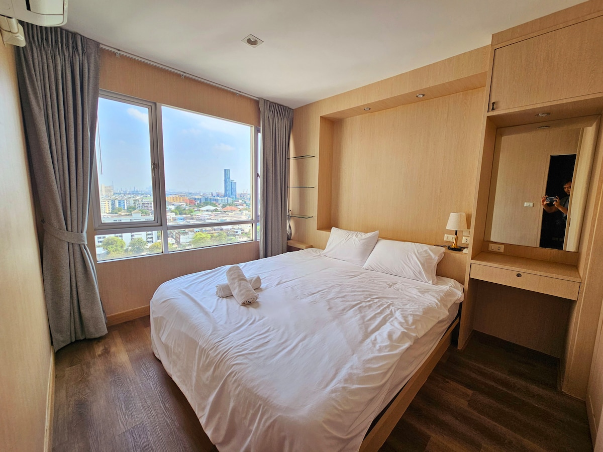 奢华高层•曼谷全景两居公寓 这是一套曼谷极为罕见的“房王”级户型,面积约92㎡,客厅宽阔,采光充足,舒适惬意,适合休闲或聚会。 空间布局 •两房两卫,家具齐全,并贴心配备挂烫机。 •主卧带独立卫浴,浴缸紧邻落地窗,可一边泡浴一边俯瞰城市夜景。 •公共卫浴干湿分离,整洁实用。 绝佳景观 房间位于高层,窗外城市风光一览无余,无论白天或夜晚,都能欣赏曼谷天际线与繁华街景。 生活便利 大楼底层即是美食夜市,小吃、便利店、按摩店一应俱全。大楼还设有rooftop餐吧,边用餐边享受城市全景。 静谧舒心 虽身处热闹街区,房间隔音极佳,远离喧嚣,保证安静舒适的休息体验。 出行便捷 步行可达 BTS 轻轨站,多条干道交汇,前往曼谷各区与机场都十分方便。 无论商务出行还是家庭度假,这里都能带来舒适与惊艳的入住体验。