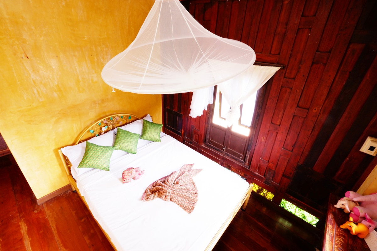 This teak little cabin house with King bed was built in 2018. It comes with private bathroom and located right on the river. Enjoy your time at your own balcony! A/C, hair dryer, wifi and some other services are provided. Breakfast is included with the room rent.