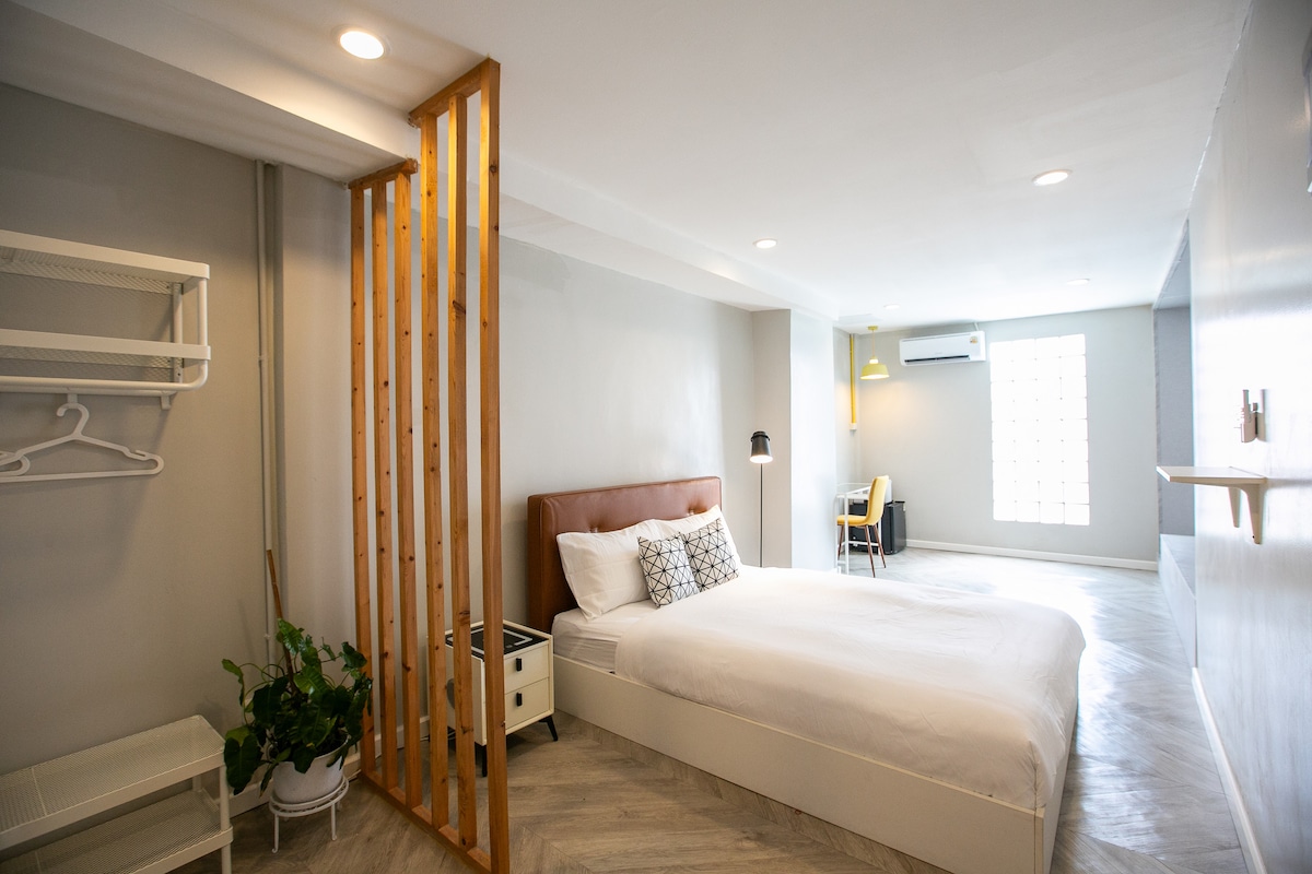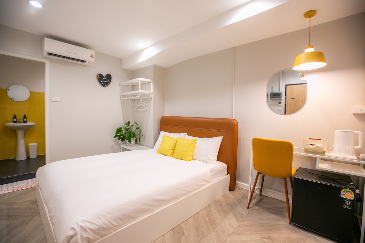 Welcome to your comfortable home away from home(Room 202) Clean, modern room with cozy bed and vibrant artwork. Air conditioning, fresh linens, and blackout curtains ensure restful sleep. Amenities: Refrigerator, hot water, washer/dryer downstairs Location: 1-min walk to 7-Eleven | 25 km to Don Mueang Airport | 75 km to Suvarnabhumi Airport Perfect for travelers, business trips, or extended stays. We're here to help throughout your visit!