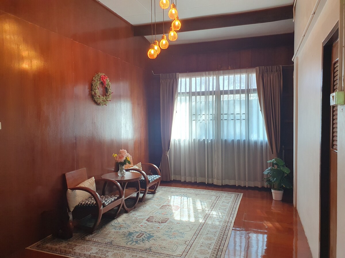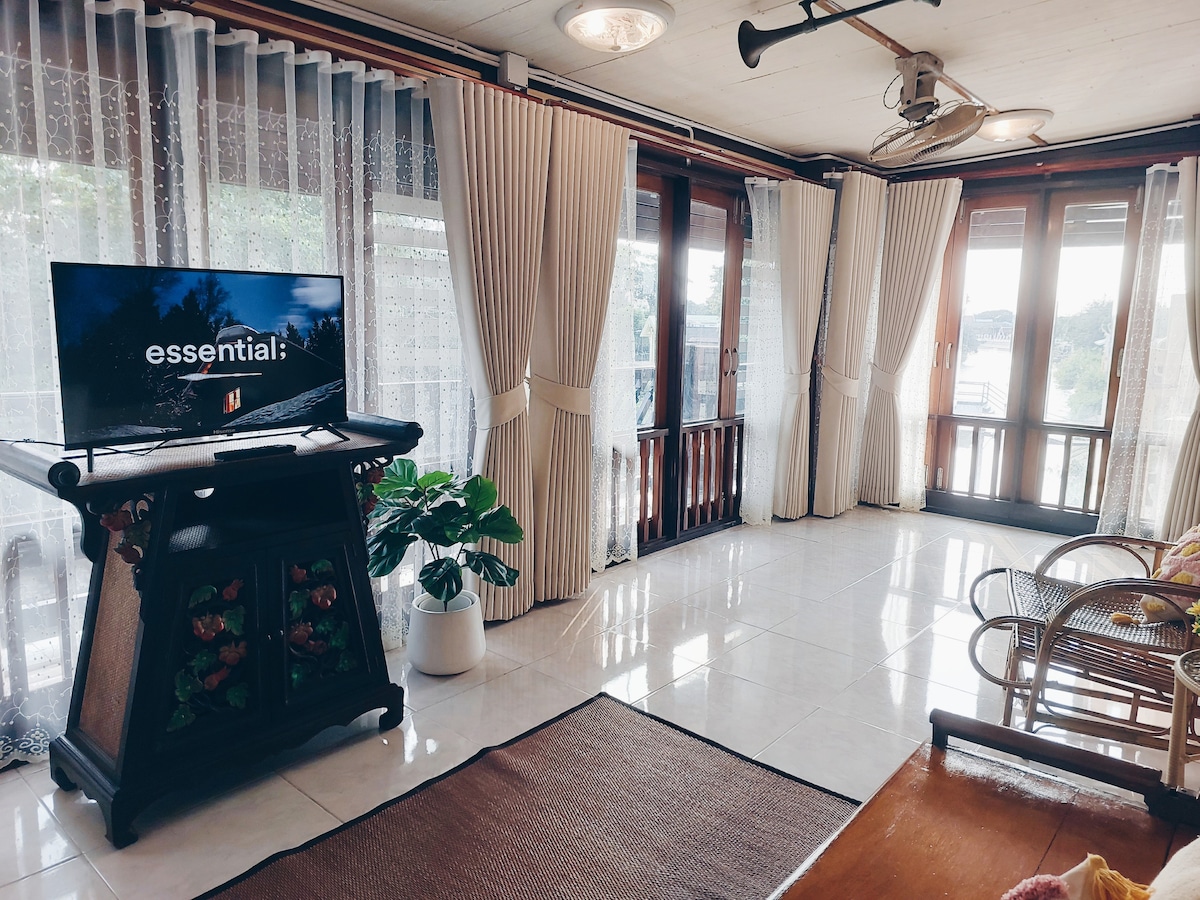 Welcome to Our Green Riverside Homestay (2 Bedrooms) Bedroom 1 (2F): A spacious Family room for up to 5 guests. Bedroom 2 (1F): A cozy Double room for 2 guests. •Each room has a private bathroom, living area, and river views. •Free Wi-Fi •Free minibar •Bicycle for rent •Private pier •️Opposite to toy museum ️•1 min to Wat Phranomyong •2 mins to 7-11, Go fresh, restaurants, street food stalls ️•5 mins to Historical Park •️10 mins to Wat Phu Khao Thong