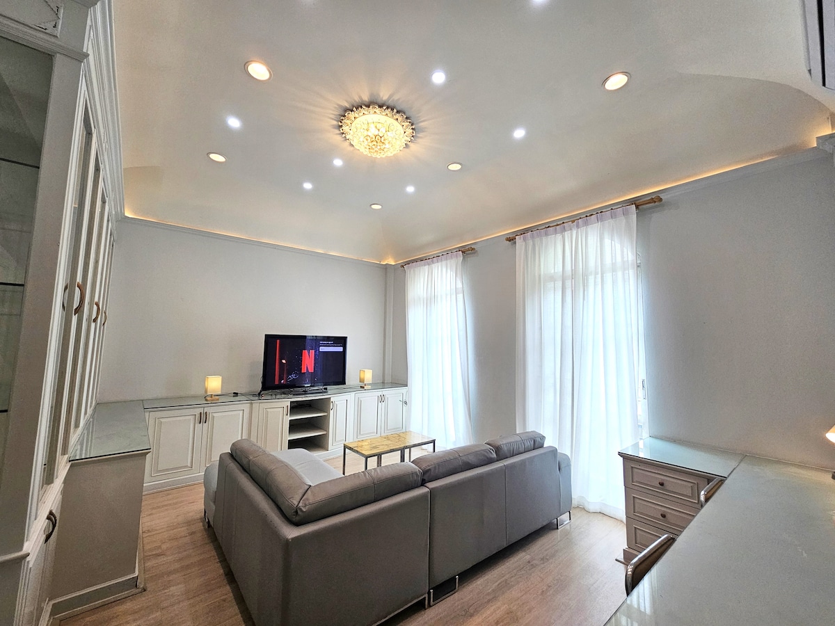 Modern designed and recently renovated townhouse. 5 bedrooms, 7 King size beds, 4.5 bathrooms. The house features private and peaceful townhouse with kitchenette, pool table, dining table, sofas and TV. Good bedroom furnishings with 5-Stars hotel mattresses. This townhouse will be ideal for a family, and friends. Located in superb location surrounded by many local street food close to Lan Sai Plaza Market(350m), Tops Supermarket(600m) Teminal 21 Rama 3 (6km), and only 100m from the 7/11.