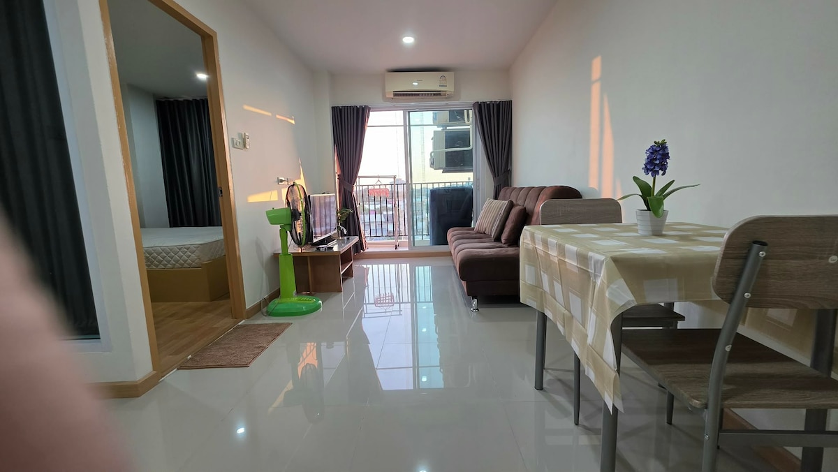 Lampang Happy Stay is a bright 38 m² one-bedroom apartment on the 6th floor in Lampang city centre near Wat Chiang Rai. It features a separate bedroom with a queen-size bed, air-conditioning in both bedroom and living room, a cozy sofa, TV, dining table, and kitchenette. A new washing machine and full-size fridge make it ideal for short or long stays. Enjoy a nice city view and a comfortable, happy stay in Lampang.