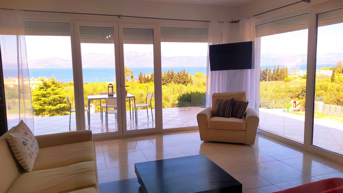 This charming two-level seaside villa surrounded by olive trees on an area of ​​2.5 acres, ideal for families or couples, possibility of excursions to the archaeological sites of Delphi & Dion, Evia and Sporades (Skiathos, Skopelos, Alonissos) and Pelion - 50 meters from the beach. View of the northern Euboean Gulf, 2 km from Glyfa. It comfortably accommodates up to 8 people and has a spacious interior of 150m² with a covered terrace with barbecue area