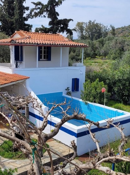 The house is in a quiet and secluded location at the edge of Milina village, half a kilometre from the seafront. The Lafkos hillside rises steeply behind and the surrounding trees and greenery help to keep the house cool even in really hot weather. This spacious family home has a large garden and only one immediate neighbour.
