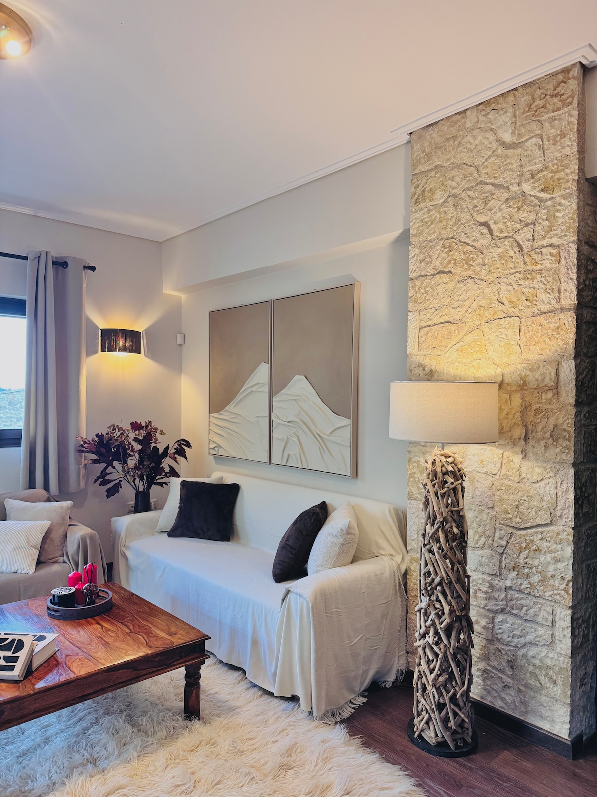 The appartment is on the fourth floor of a building on the mountain with view of the sea.It has three bedrooms.One master bedroom and another two that are there are two bathrooms.A small one with a shower and a bigger one with a hydromassage bathtub .Its kitchen is big and it's fully equipped. Last but not least there is a leaving room where you will find a dinning table and a comfortable couch in front of an energy fireplace so as you can enjoy your stay, relax ,create warm and romantic nights