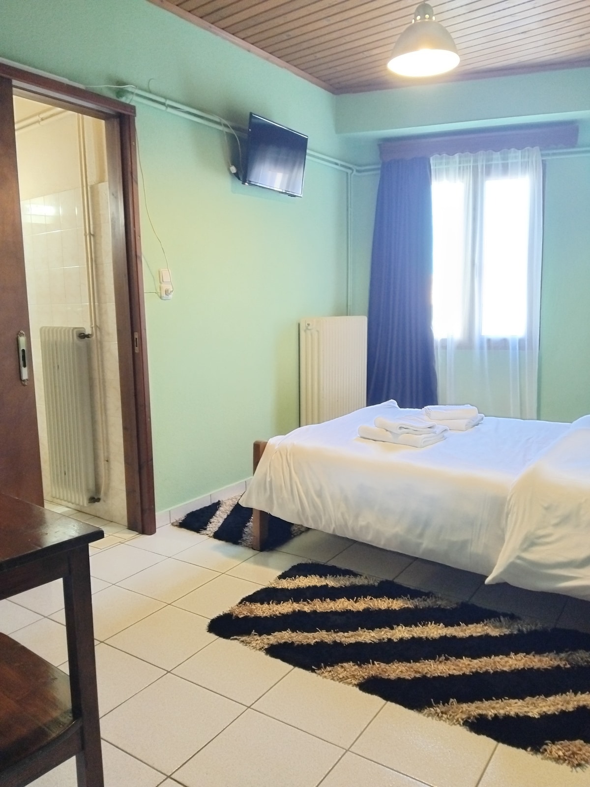 Δίκλινο δωμάτιο 10–12 τ.μ., ιδανικό για ζευγάρια ή μεμονωμένους επισκέπτες. Διαθέτει διπλό κρεβάτι, ιδιωτικό μπάνιο, τηλεόραση, ψυγειάκι, Wi-Fi και κεντρική θέρμανση. Το δωμάτιο βρίσκεται στον 2ο όροφο του κτιρίου με κοινή είσοδο. Η πρόσβαση γίνεται μόνο από σκάλες, δεν υπάρχει ασανσέρ.