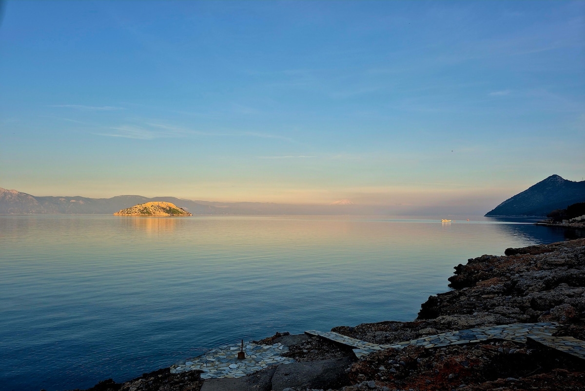 Faites une pause et détendez-vous dans cette oasis paisible, a 1heure d'Athénes, 1h30 de DELPHES et une 1/2 de l ile d' eubée dans le golfe de skroponeria. Situé a 50m de la mer, possibilité de faire du paddle et du kayak ( et du jet ski moyennant supplément) Venez pecher moules et oursins dans le golfe ou avec un peu de chance vous pourrez apercevoir phoques et dauphins .Le studio est attenant à notre maison tout en gardant votre indépendance.Possibilité 2 chambres independantes suplémentaires