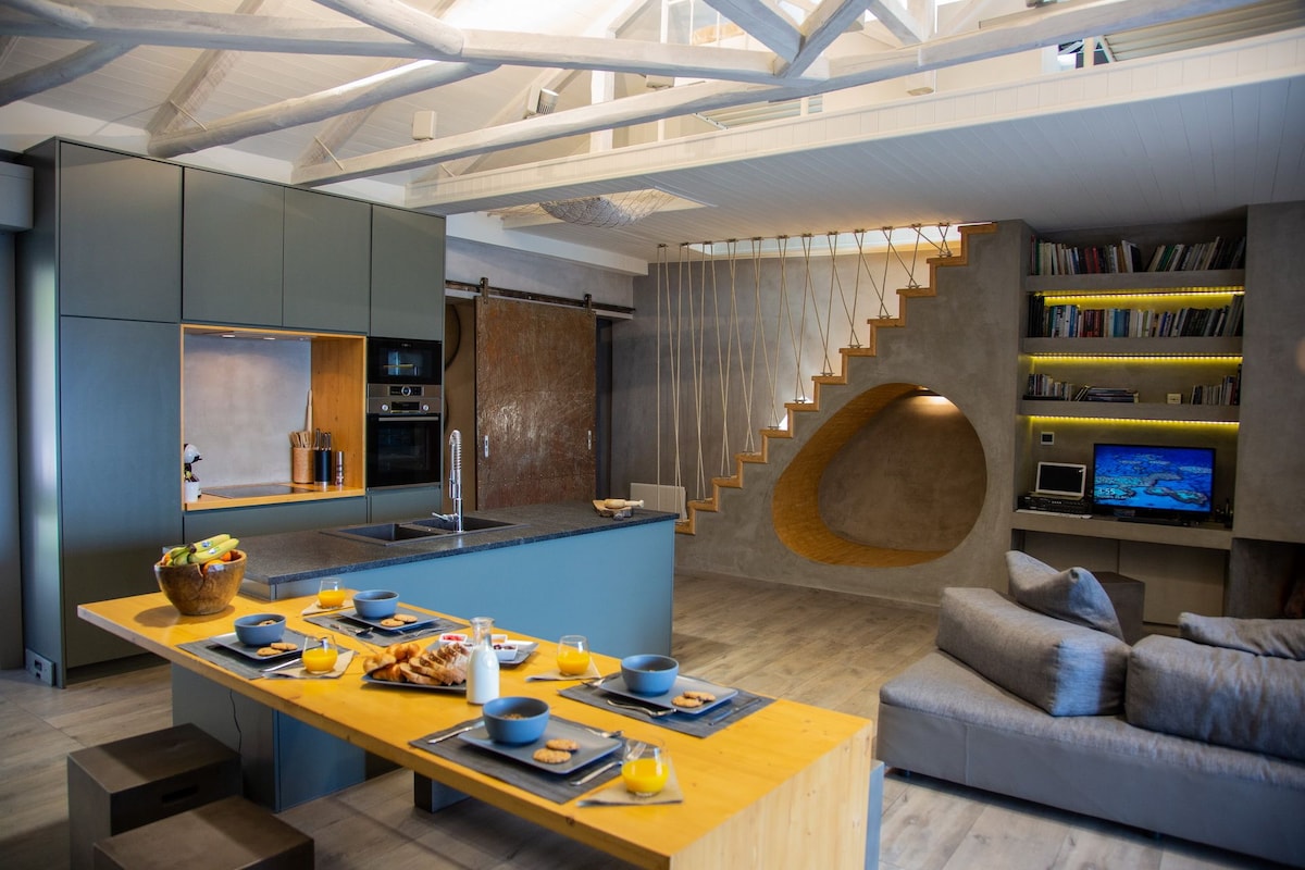 The charming and spacious Spa Villa Skaloma of 120sqm with large spaces and sunny lounge that is open to the south, is a luxury two-storey villa that can accommodate up to six people, in two bedrooms and two bathrooms. Villa, the combination of high ceilings with large tree trunks and large openings, allow a stunning view of the sea. “It's built in with the sea" as it is only 10 meters away from it and is located in the best part of the beach, under plane trees and near a small sea platform.