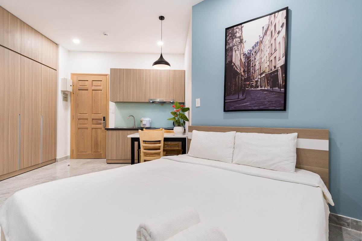 【都市绿洲】胡志明市市中心核心区轻奢公寓 | 45㎡全景一居 | 5分钟全能生活圈 🏙️ 核心卖点: 1. 黄金区位 - 市区正中心,步行5分钟直达: • 2mins网红咖啡馆集群 | 地道越式餐厅 | 24h全家便利店 • 2mins大型生活超市 • 600 米直达粉红教堂/1 公里战争遗迹博物馆/西贡河滨步道 2. 轻奢居住体验: √ 全景落地窗阳台配设计师桌椅组合,180°城市天际线日落观景台 √ 德国Emma记忆棉床垫+60支棉裸睡级床品 √ 三星The Frame艺术电视(预装Netflix/Disney+/YouTube) √ 智能门锁+双重安保系统(24h监控+电动闸门) 3. 商务友好配置: ⚡ 高速无线网络(带独立路由器) ✈️ 办公椅+1.5米加长书桌 4. 便利设施: • 免费摩托停车位(1位) • 每周两次免费保洁(长租专属) 【智能入住】手机app遥控大门+密码钥匙盒自助check-in