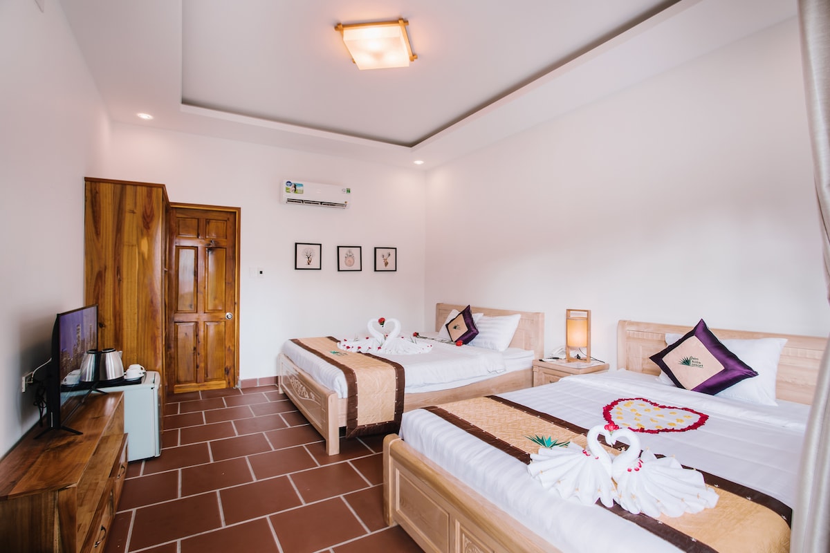 Triple Room with Shared Bathroom This room is equipped with three single beds and air conditioning, offering towels, personal lockers, clothes hangers, and bottled water. Guests can access gender-separated shared bathrooms with hot water showers. Daily housekeeping service is provided to ensure a clean and comfortable stay. It’s ideal for small groups looking to explore Phu Quoc together.