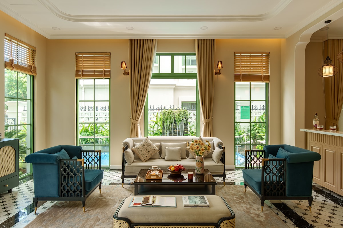 The villa is located in the luxurious Bãi Khem resort 🏖️, featuring 4 spacious bedrooms and modern amenities in the Modern Tropical style. The minimalist and refined design uses natural materials like wood and stone, creating a peaceful atmosphere. The indoor communal swimming pool offers a relaxing and sociable space 🏊♂️ Just 500 meters from the beach, it provides easy access to white sand beach and crystal-clear waters 🌊, blending modern conveniences with a tranquil lifestyle.