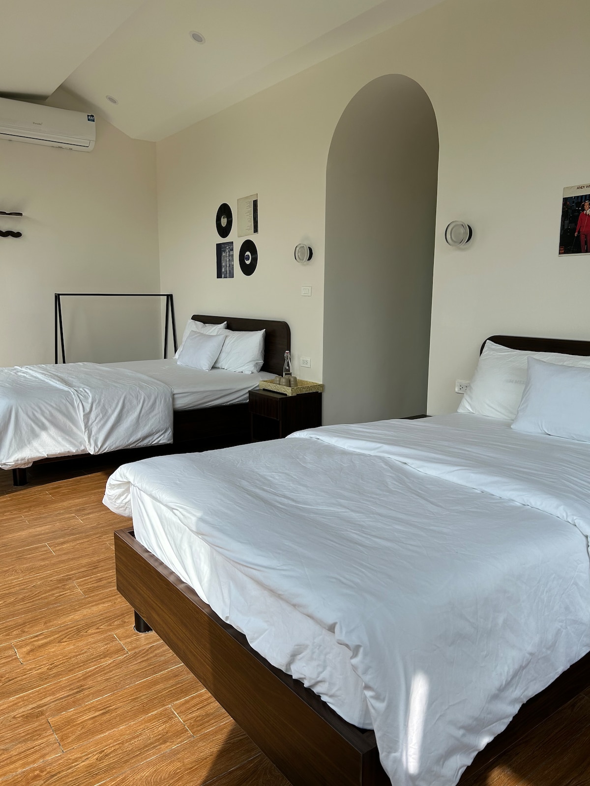 A spacious and sunny room with two double beds, five charming windows – including sunrise-facing ones right by the headboard – and a private balcony perfect for morning tea overlooking the pebble-paved yard. Light-filled and full of fresh air, it’s ideal for couples, small families, or a group of close friends.