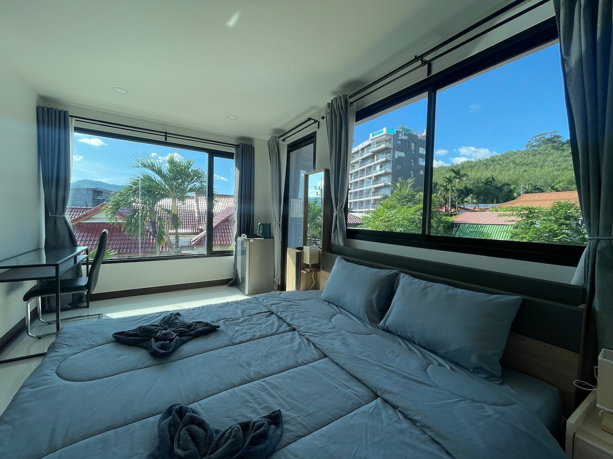 Studio on Soi Ta-iad (Fitness Street) in Chalong, Phuket, surrounded by gyms, cafes, restaurants, laundromats, and motorbike rentals. The space includes a king bed, fridge, TV, toilet, shower, and a small balcony. Enjoy street and mountain views from large open windows. Ideal for digital nomads, with a desk and high-speed fiber optic internet. Weekly cleaning provided, with electricity and water included. Perfect for fitness enthusiasts or travelers looking for a comfortable, convenient stay.