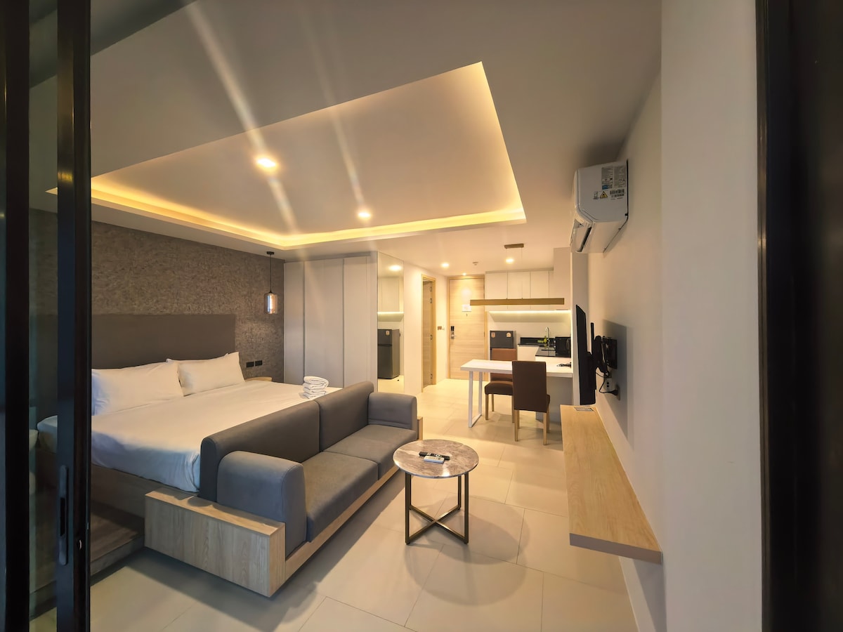 这是一间位于卡伦(Karon)海滩附近的全新现代公寓,距离海滩仅约 800 米(步行 10 分钟),位置优越,生活便利。这里是普吉岛西南岸最受欢迎、又相对宁静的度假区域之一,非常适合想要放松、享受海岛风情的旅客。 公寓面积约 35 平方米,为单间设计,风格现代简约,配有 高速无线网络,入住后水、电、网络均已包含,无需额外付费。 房间配备齐全的厨房设施——冰箱、微波炉、电磁炉等,可自行烹饪。 入住时我们还贴心准备了矿泉水与一些洗漱用品,让您拎包即可入住。 公寓楼设施完善,设有 两座屋顶无边泳池、健身房 以及 餐厅,您可以在泳池边欣赏卡伦海滩的壮丽景色,享受惬意的度假时光。 📍 位置与周边景点 🚶♀️ 卡伦海滩:约 800 米,步行 10 分钟 🚗 卡塔海滩:约 5 分钟车程(2.5 公里) 🚗 芭东海滩:约 10 分钟车程(6 公里) 🚗 查龙寺:约 15 分钟车程 🚗 大佛 :约 20 分钟车 🚗 普吉镇:约 25 分钟车程 区域内餐厅便利店、按摩店和夜市齐全,生活与娱乐十分方便。