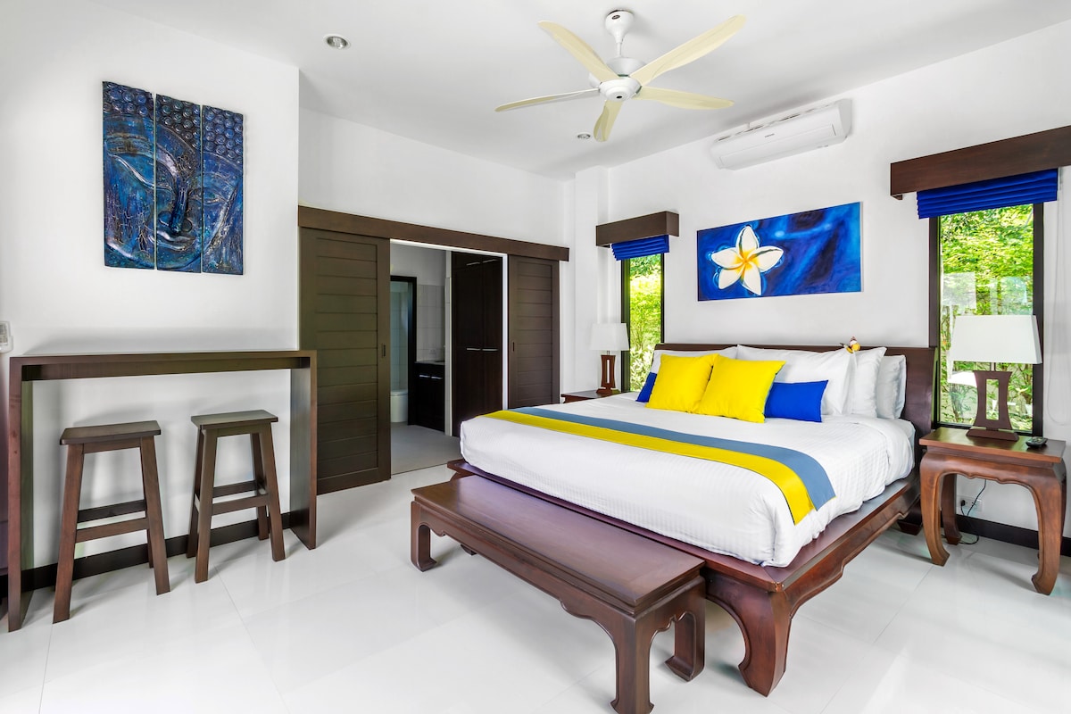 Surrounded by tropical gardens, this spacious bedroom is set in a calm & peaceful environment. Part of a four-bedroom guesthouse on the edge of a beautiful rubber tree forest, this is an ideal location for families and friends traveling together wanting an intimate stay in Rawai, Phuket. A large swimming pool, bar area, exterior lounge and game room are also accessible. A continental breakfast is included. The perfect place to relax, unwind and enjoy the best that Thailand has to offer.
