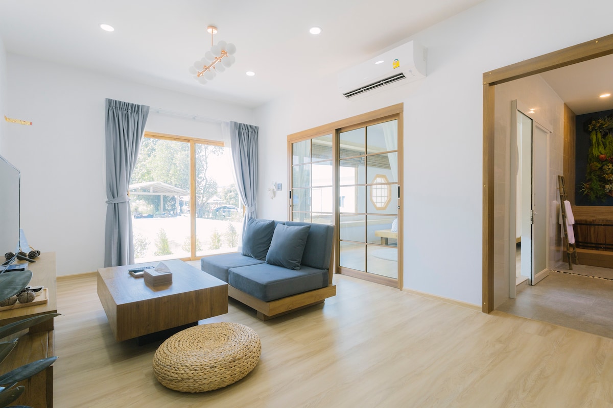 My villa have a space of 60 sqm. We also have LED TV , cable TV , air condition , tea table desk, kitchen that you can make food, coffee drip , special artist floor lamp from north of Thailand, before you come in we have a key card system on our door. I make my villa have a feeling of Japanese styles in the room and in the bathroom.