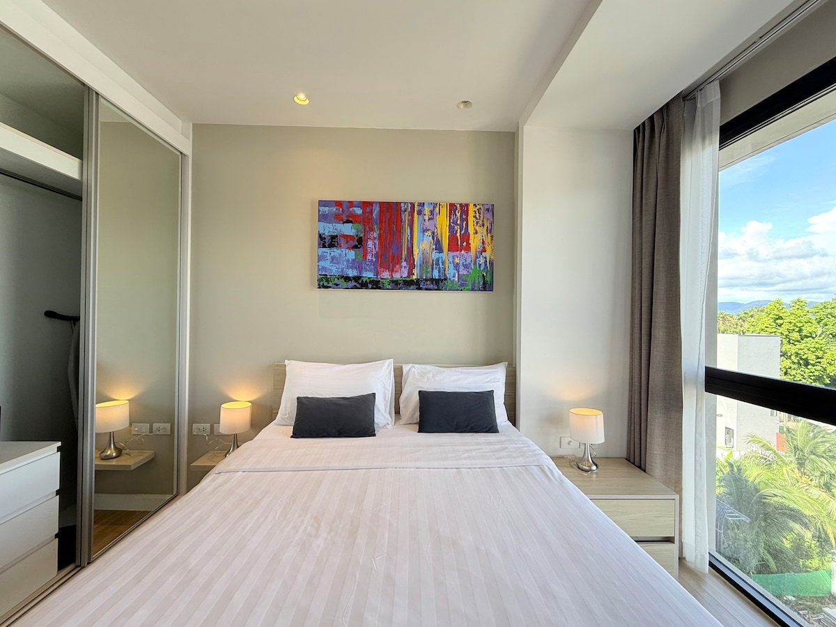 This 1 bedroom unit with green view located at the biggest condo in the area 5 min walk from Surin beach. Room has washer, 2 aircons, european kitchen, sliding door partition between living room and bedroom, 2 aircons and large bathroom. Condo has 6 swimming pools, 4 of them are roof top with panoramic beautiful ocean and mountain view. There are 2 gyms, saunas, free parking and coworking room in the common areas.
