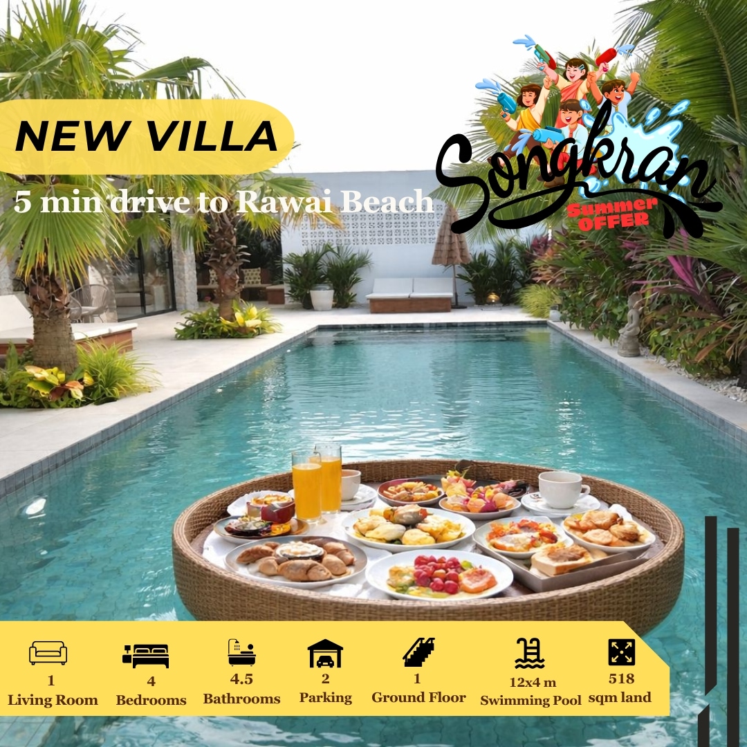 Only 7 minutes walk to beautiful Surin Beach. 4 bedroom Designer villa (280 m2 interior). 3 bedrooms inside the main villa building and the 4th one attached with an access from the garden, pool view. 33 x 8 meter common swimming pool in a large oriental garden. Living room and fully equipped kitchen. Modern Asian style with decorations. Included is breakfast and two way airport transfers.