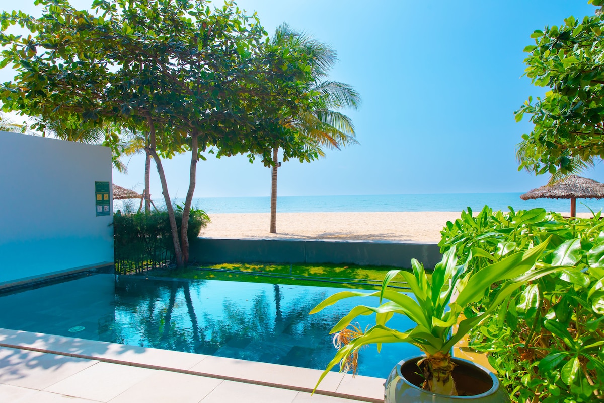 This is BEACHFRONT PRIVATE POOL VILLA 4 BR+ 4 bathrooms, belongs to the phase 2 of Sanctuary Ho Tram resort. - Land area: 492m2 -4 double bedrooms (included 3 double bed rooms with balcony with en suited bathroom + 1 double bed room downstairs using the bathroom outside the room). - Accommodation 8 adults + 4 children under 11 y.o -Enormous sun deck for entertaining -Peaceful, tropical landscaped gardens -Fully equipped kitchen -Private swimming pool -Covered parking
