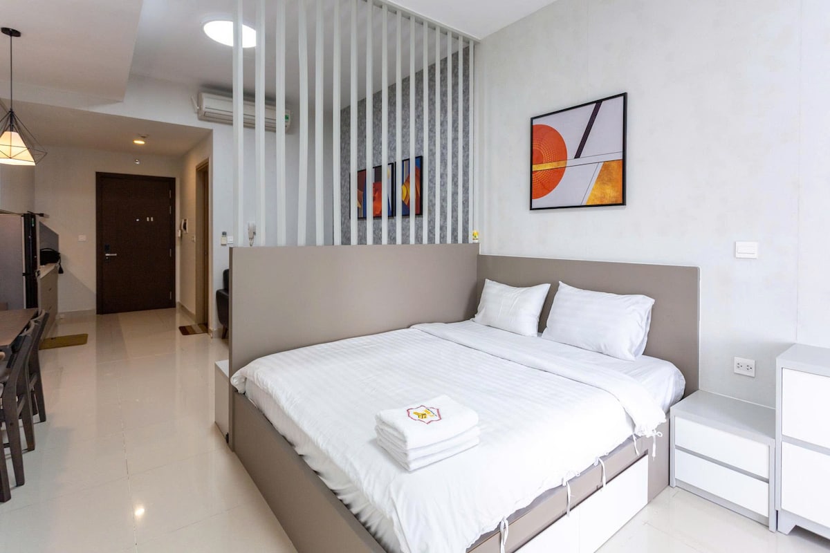 Discover a tranquil Japanese-style apartment in District 7, just 1 km from Phu My Hung. This 55m², one-bedroom space blends modern minimalism, offering river views and a tranquil ambiance. Enjoy a fully equipped kitchen, smart TV, high-speed Wi-Fi, and comfortable bedding, including an extra bed. The building features a rooftop infinity pool, sauna, gym, and on-site conveniences like cafés, convenience stores, ATMs, and children’s play area. Perfect for a relaxing and convenient stay in Saigon.