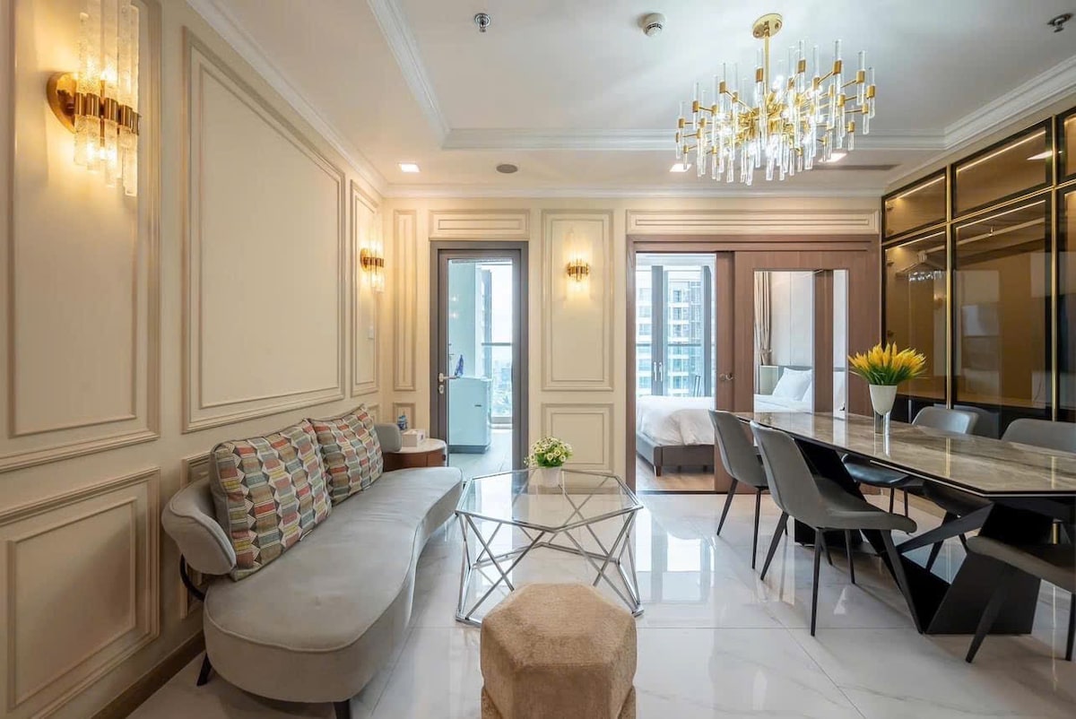 Cozy luxury apt on 6th floor located in a prime location just 10 minutes drive from the city center. 64sqm wide apt with all amenities and space to make you feel like at home. You can lie down on a soft king-size bed for a good night's sleep, cook in the kitchen, lie on the sofa watching the Landmark 81 building sparkle at night or sip a hot cup of coffee on the balcony watching the sunrise. A luxurious rooftop swimming pool, 2 mini supermarkets: 7 eleven and Winmart. Friendly and helpful owner.
