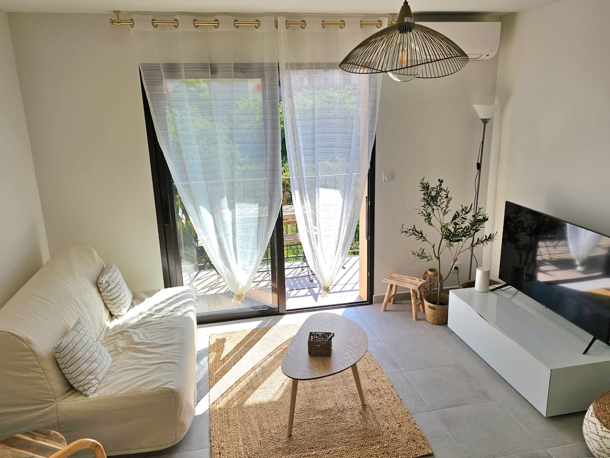 Notre logement offre une magnifique vue sur la montagne. Vous partagerez avec nous une piscine de 6X3M. La plage est accessible à pieds. Totalement rénové par nos soins, avec une décoration unique et raffinée. Vous disposez de 2 lits individuels dans la chambre et d’un divan lit 140X190 dans le séjour. La terrasse est équipée de fauteuils, table, chaises, barbecue. Isolés dans un immense jardin vous y serez au calme absolu. Vos enfants et animaux pourront y circuler en toute sécurité