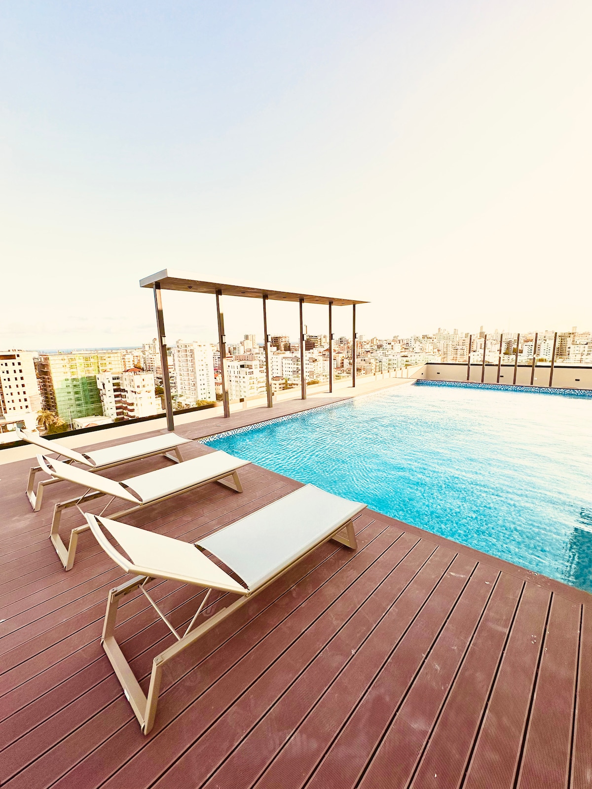 Vive una experiencia única en nuestro cómodo y lujoso apartamento en la exclusiva area de Piantini, Dormitorio con cama king, 2 televisores inteligentes 55'', WIFI alta velocidad, Full Linea blanca, cocina y area de lavado, hermosa terraza con una vista maravillosa. También podrás disfrutar de una Hermosa area social con PISCINA, BBQ y GYM o salir a disfrutar de una tarde de Shopping y las diferentes gastronomías que te ofrecen los lujosos restaurantes que se encuentran al rededor del are