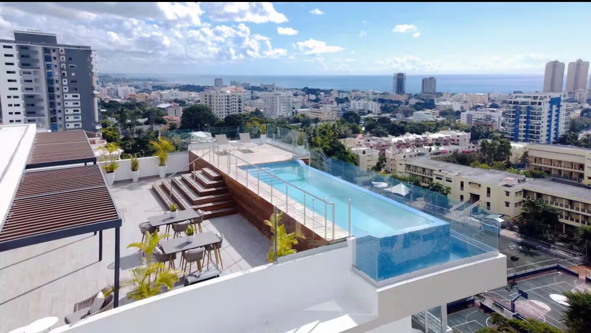 Bienvenido a tu nuevo hogar en Santo Domingo; este espacio ha sido diseñado para proporcionarte una experiencia única. WIFI RÁPIDO SALA -Sofá grande -Aire acondicionado -Smart TV -TERRACE/BALCONY Impresionantes vistas de la ciudad DINING / COCINA -Asientos para dos -Refrigerador/Estufa -Utensilios HABITACIÓN -Cama king. -Smart Tv -Aire acondicionado -Baño -Piscina y barbacoa -Lobby -GYM -Dos ascensores -1 parqueo -Smart Lock ¿Qué estás esperando? Reserva tu estadía el día de hoy!