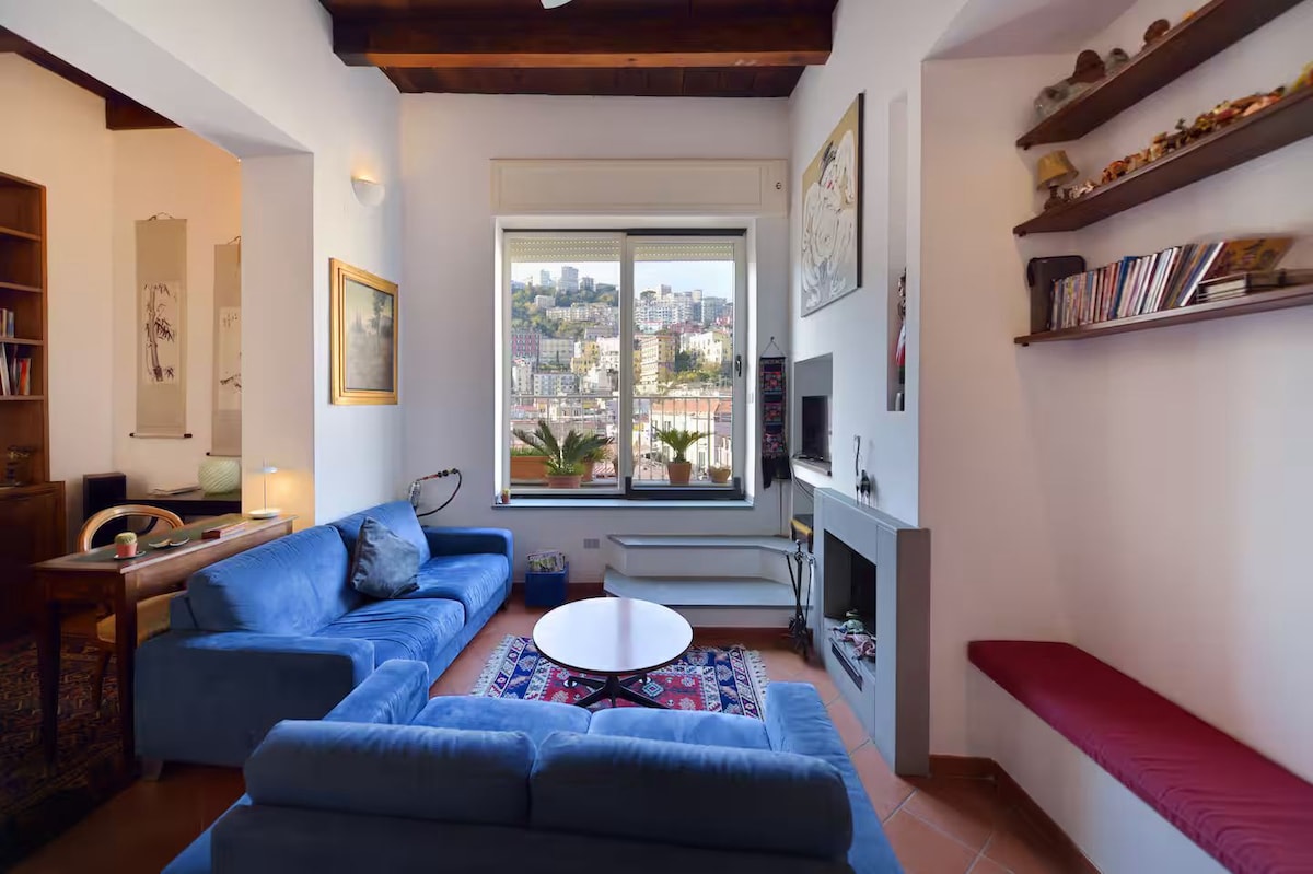 Panoramicissimo e romantico attico di circa 100 mq, con cucina attrezzata , 1 camera da letto , leaving room con un ampio love sofà adattabile come terzo e quarto letto , camino e terrazzo belvedere con un panorama mozzafiato unico a 360 gradi sulla città di Napoli , nel palazzo storico dove SOFIA LOREN e VITTORIO DE SICA girarono gli episodi del famoso film l'oro di Napoli con ,a 5 minuti la Metro di Materdei ed il Museo Archeologico e Piazza Bellini porta del centro Storico Napoli Antica