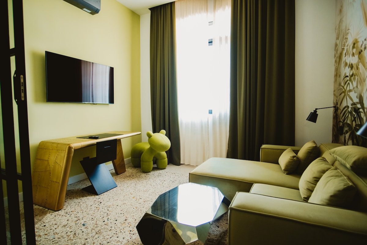 Spaziosa suite con arredi eleganti e moderni, bagno privato con doccia emozionale, set di cortesia. La doccia emozionale combina in sé gli elementi della natura: l'acqua, i colori, gli aromi per offrire un'esperienza unica che può trasformarsi in un vero e proprio trattamento rigenerante per corpo e mente. Servizi Bagno con set di cortesia e Phon, Aria Condizionata, Riscaldamento, Cassaforte, Minibar, TV, Zona Soggiorno con Balcone, Divano e Bollitore