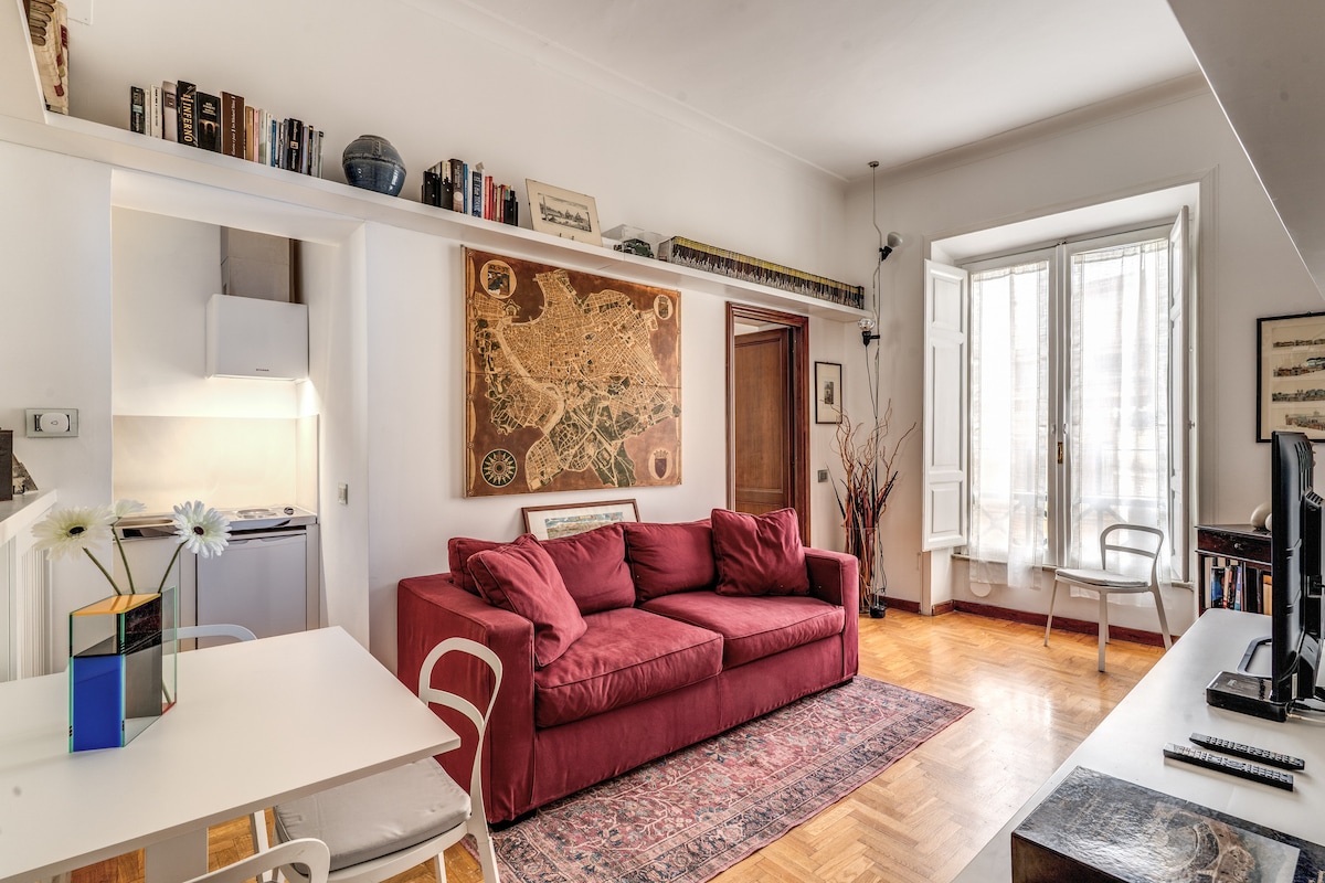 L’appartamento è situato nella centralissima zona “Prati” ed è composto da una grande cucina ben attrezzata, da un soggiorno dove si trova un comodo divano letto ad una piazza e mezzo, da una camera con letto matrimoniale e da un grande bagno. A beautiful apartment perfectly situated in the very heart of Rome. Comfy living room with a sofa bed, fully-equipped kitchen, double bedroom, large bathroom.