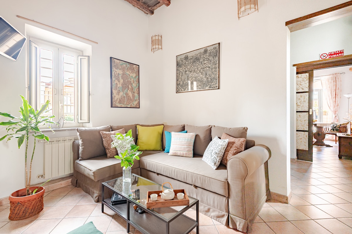 Light the large stone fire and relax with a book in this elegant home overlooking Via dei Banchi Nuovi. Coffered ceilings cap cozy rooms in relaxing, neutral tones accented by designer furnishings and owner's original paintings. This charming fully renovated house is located in one of the most beautiful, ancient and vibrant area of the center of the Eternal City. We also like to offer eco-sustainable hospitality: we use electricity from renewable sources, organic products.
