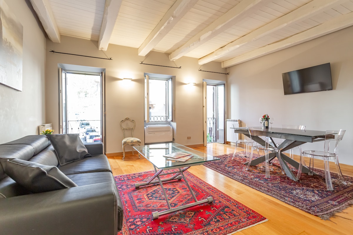 This bright and spacious loft apartment was recently entirely renovated. A wide window wall faces the Tiber river allowing a lot of sunlight to come in. There are beautiful Tuscan cotto floors and modern design furniture. There is a new fully equipped kitchen with a Nespresso coffee machine, air conditioning, heating system with adjustable temp, unlimited wi-fi, a washer/dryer, a bathroom with tub and shower. The flat sleeps four persons in a king size bed and a comfortable king size sofa bed