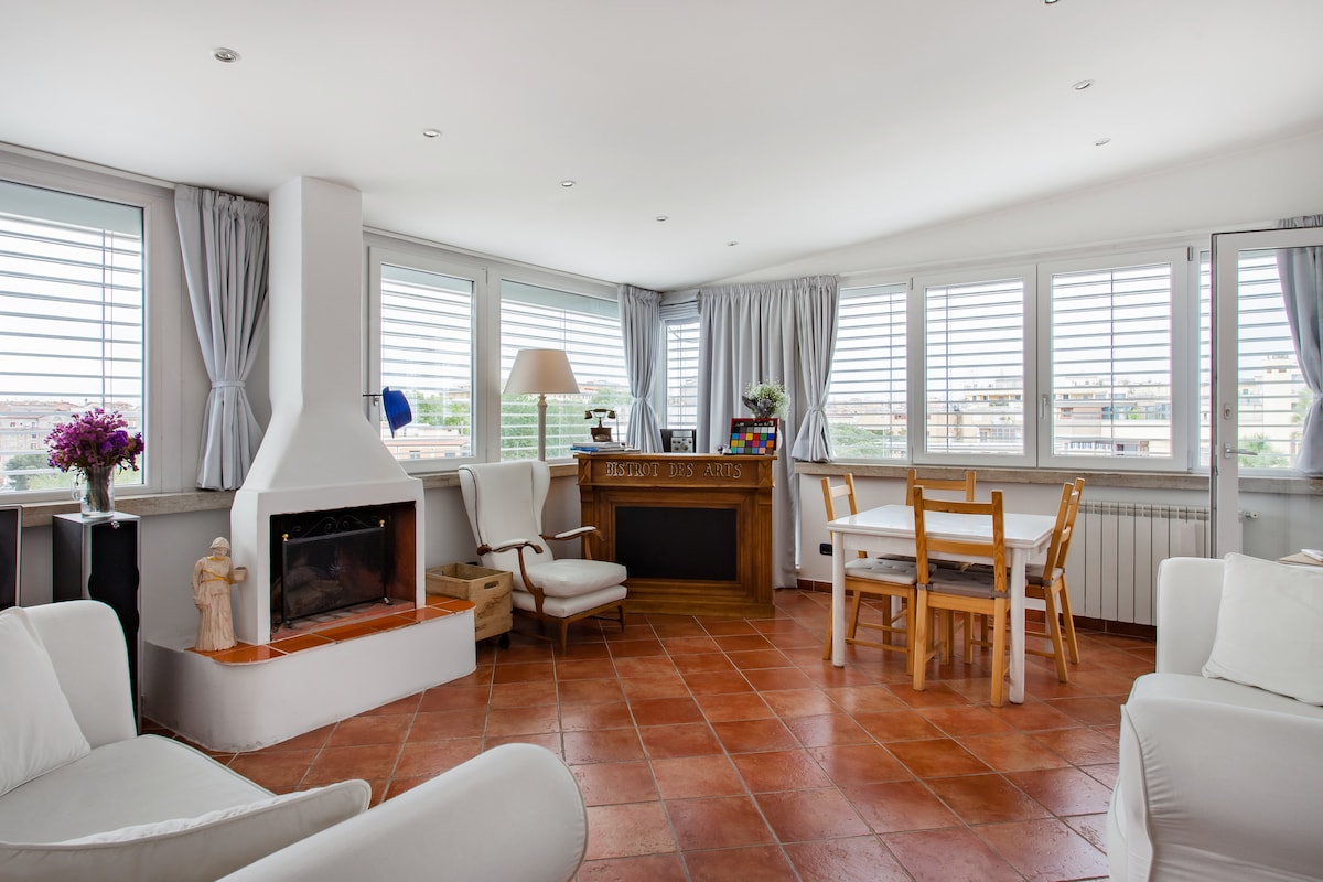 In the center of Rome a private penthouse open louvered window coverings in a living room to maximize light and reveal wraparound views of Central Rome and St peter's basilica. A period fireplace, terra cotta tiles create a traditional feel. Private terrace fully furnished. Two double bed rooms. Ten minutes walk from St Peter's square and Vatican Museums. Overlooking Rome and St Peter's. 2 minutes walk to public transportation, bus & metro will take you easily to all the main historical sites.