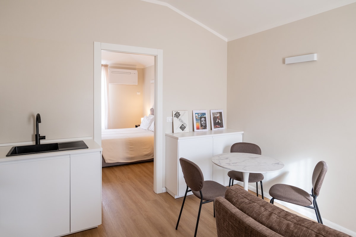 Elegant, completely renovated apartment above the famous porticoes of Bologna, recently appointed World Heritage by UNESCO. The space includes a large bathroom and an open-space area with a fully equipped kitchen and a living area with a comfortable bed for two people. During the restoration, frescoes dating back to the 19th century were discovered and are now enhanced by a sophisticated lighting system. The refined décor recalls the Rococo opulence and avant-garde of the 1970s.