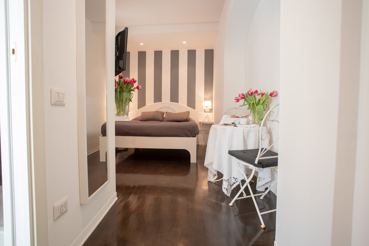 Camera matrimoniale nell'elegante boutique di poche camere nel centro storico di Roma, tra Colosseo e Termini vicino a Fontana di Trevi e Piazza di Spagna. Roman Holidays si trova nel quartiere Monti, nell'edificio del 1884, a pochi minuti dalla Stazione Termini e principali attrazioni turistiche, facilmente raggiungibili a piedi. L'ambiente riservato con poche camere dall'arredamento raffinato e moderno