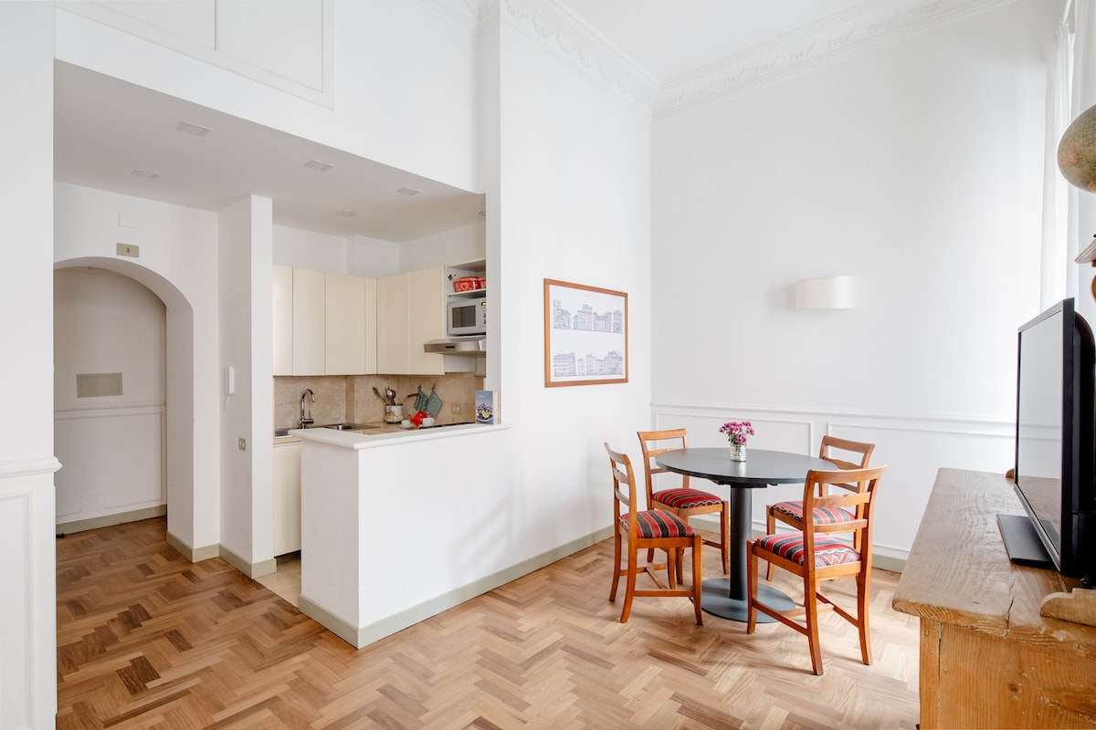Charming private apartment with direct and unparalleled views of the iconic Pantheon, Temple of the Gods. The 100m² apartment is a romantic retreat adorned with wooden beams that enhance its historic charm. Relax on the living room sofa with a cup of tea or a glass of wine while admiring the majestic Pantheon. In the heart of Rome, perfect for couples and for visiting historical monuments, strolling through the shopping streets, and immersing yourself in the eternal soul of the city of Rome