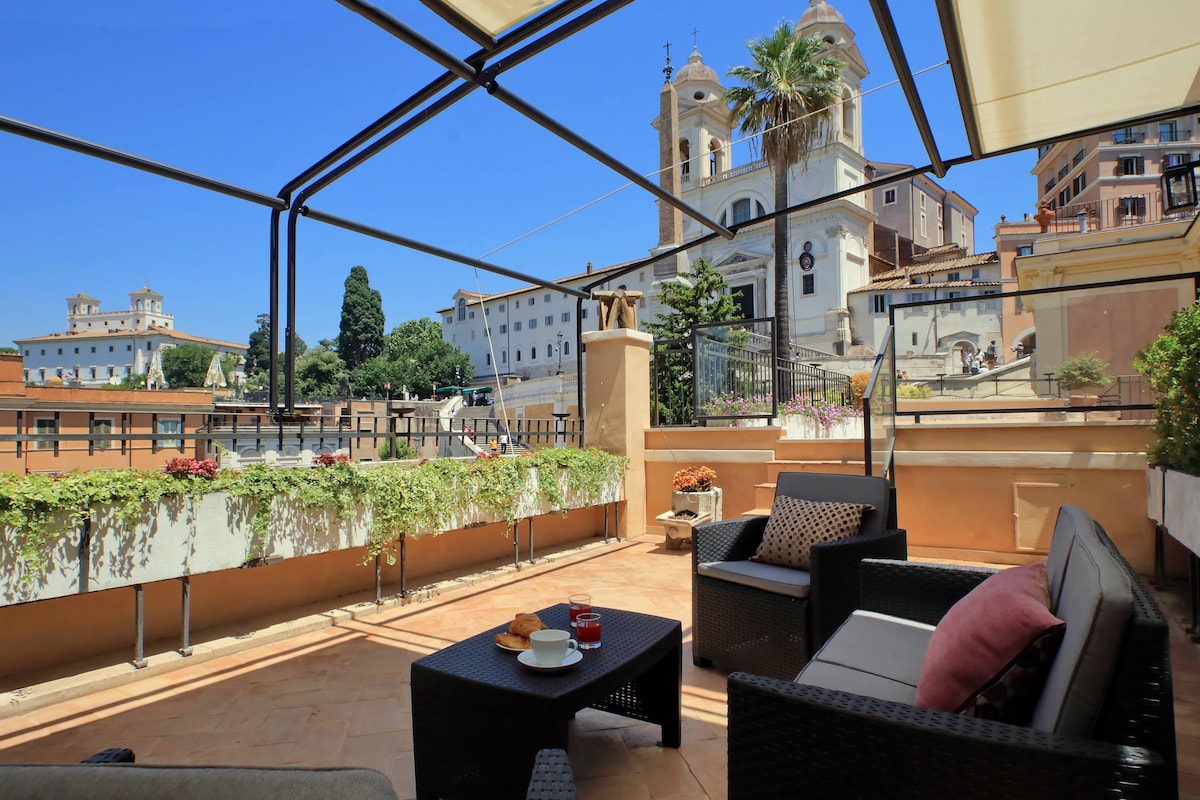 - Panoramic loft in one of Rome's best streets just a few steps from Piazza di Spagna. - Just steps away from the main sightseeing hotspots. - Extremely well positioned and connected to all major transport systems. -Gym a few steps away. - Electric window shades. - Very quiet. - Design furniture and accessories. - Very safe. - Large windows. - Sunny terrace with large sofas and dining table. - Chair lift for luggage. - Possibility of hiring a private driver to and from the airport.