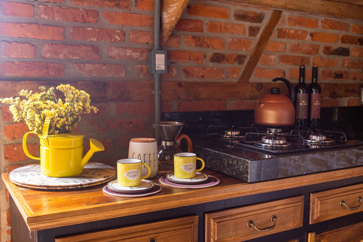 O CHALÉ AMARELO é um dos seis chalés da Vila Entre Montanhas, localizada no centro da charmosa Picada Café (Serra Gaúcha), a 1h15min de Porto Alegre. São 58m² que acomodam duas pessoas em cama queen. Além da natureza exuberante no entorno e da vista para as montanhas, conta com ofurô com hidro/cromoterapia e sais/espuma de banho, calefator a lenha, Smart TV, wi-fi, ar-condicionado, varanda para curtir o nascer do sol/estrelas, parrilla e lareira ecológica.