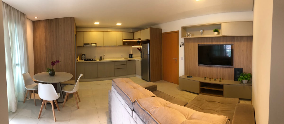 Relaxe neste espaço de bom gosto, conforto e tranquilidade. * Sala c/vista Mar e por do sol * Cozinha equipada p/a preparação de um jantar de chef, como p/um lanche rápido. Louças, taças, panelas, airfreyer * Banheiros c/ducha a gás * Suíte: Acorde olhando o mar, cama Queen, colchão king koll, muito confortável * Quarto/Escrit. Bancada p/trabalho c/ vista mar e Cama casal box * Smart TV c/assinatura de canais * Internet * Ar Condicionado em todos os cômodos Um luxo