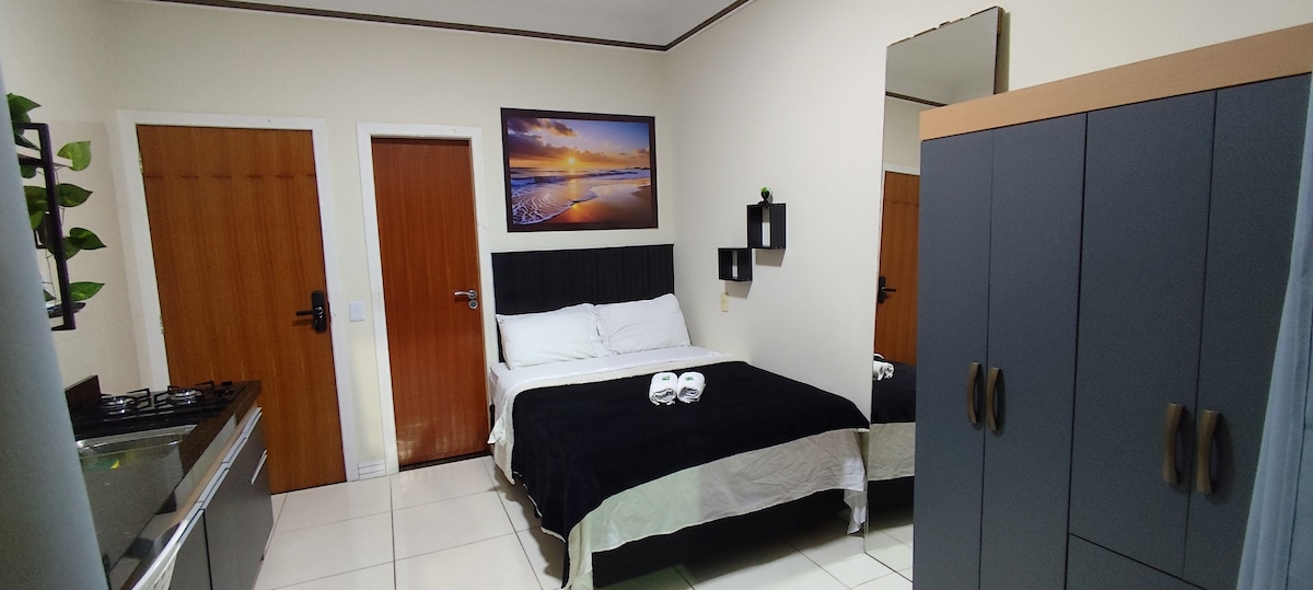 Abrace a simplicidade neste lugar tranquilo e bem-localizado. Este é um studio, completo com Quarto conjugado com a Cozinha, e Banheiro PRIVATIVO, comporta no máximo 2 pessoas Studio com sacada e vista para avenida. Ideal pra atenter sua nessecidade de férias ou negócios Dispomos de uma linda piscina de uso dos hóspedes COMPARTILHADA Localizada na Av. de entrada da cidade, a poucos metros da Praia, Prefeitura, Fórum, e Comércios