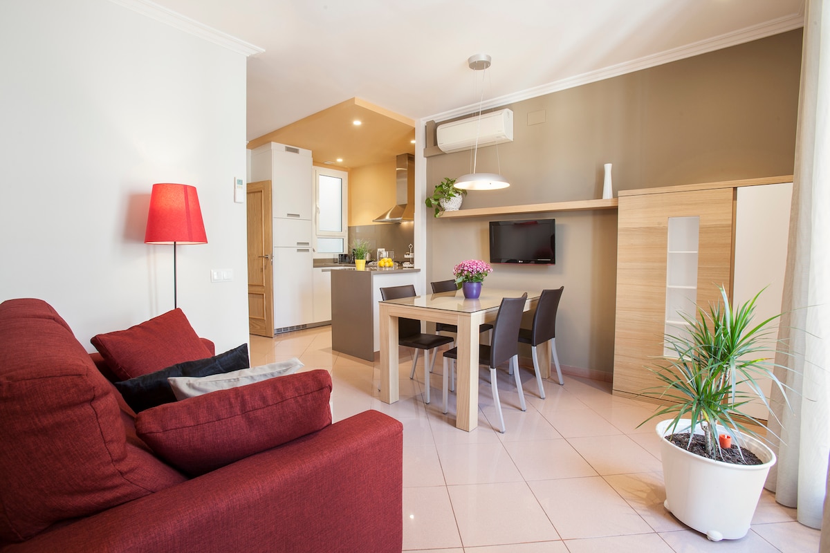 Stylish one-bedroom, one-bathroom apartment in the very central Sant Antoni area, ideal for up to four people. The bedroom has a double bed and there is a double sofa-bed in the living room that can sleep an extra two more people. It combines parquet floors & modern decor and is full of natural light. The apartment has a dining room with a large table, located near the kitchen.