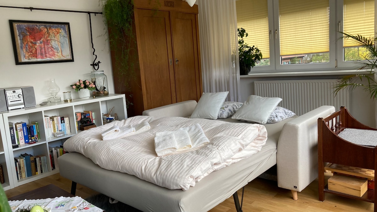 Lehne dich zurück und entspanne dich – in dieser ruhigen, stilvollen Unterkunft. Dein Blick geht ins Grüne über Gärten bis zum Wald, nur von Fern ganz leise hörst du die Stadt. Mit U-Bahn und Bus kommst du zügig in das Zentrum. Lidl und Aldi sind am U-Bahnhof, viele Geschäfte und unsere Lieblingskonditorei sind zwei Stationen entfernt. In der Wohnung bist du ungestört, kannst kochen, baden, faul sein, auf dem Balkon sitzen und ein Glas Wein trinken. Und Berlin erkunden. (Kein See in der Nähe.)