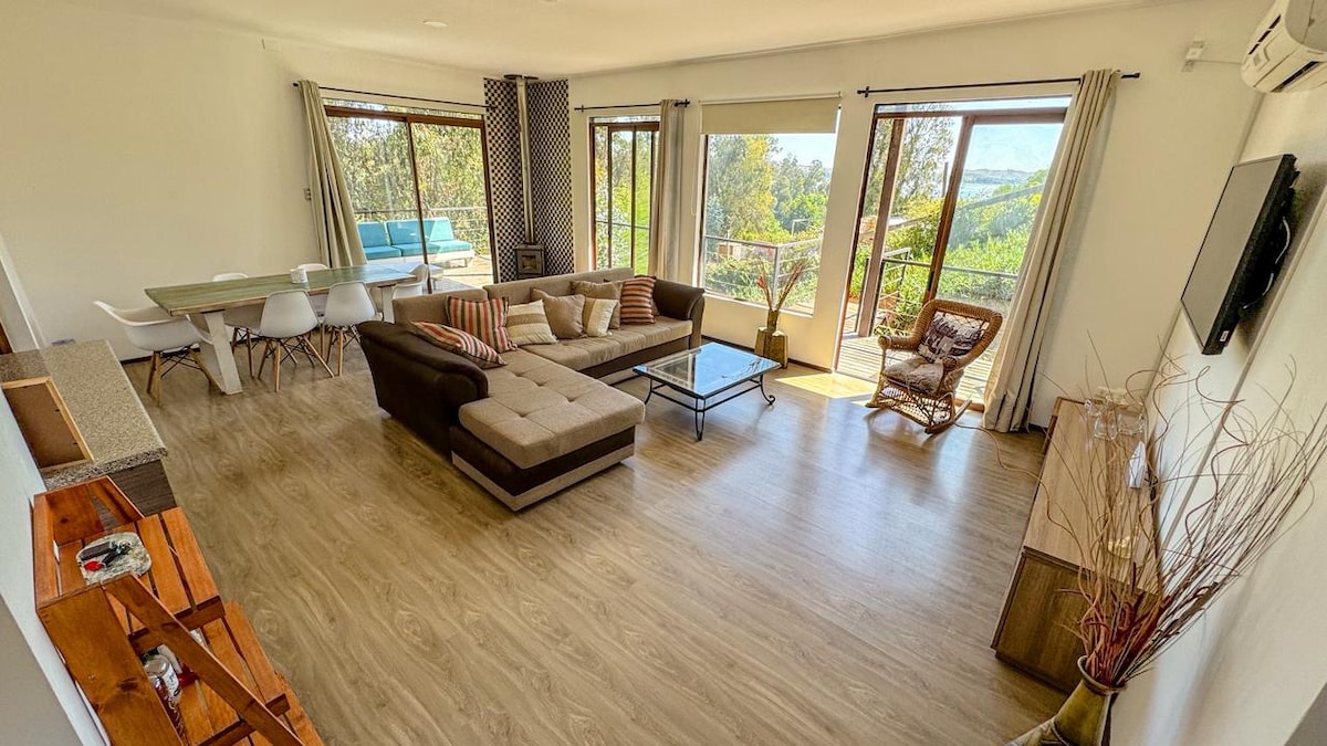 En una casa en la mitad de un campo de mandarinas y paltas. Tiene unas vistas panorámicas al valle, que ofrecen atardeceres increíbles. Tiene unas vistas pieza en suite y el resto de las camas se encuentran en un camarote en obra, en la zona común. Es una casa pensada para estar juntos y disfrutar en familia o con amigos.