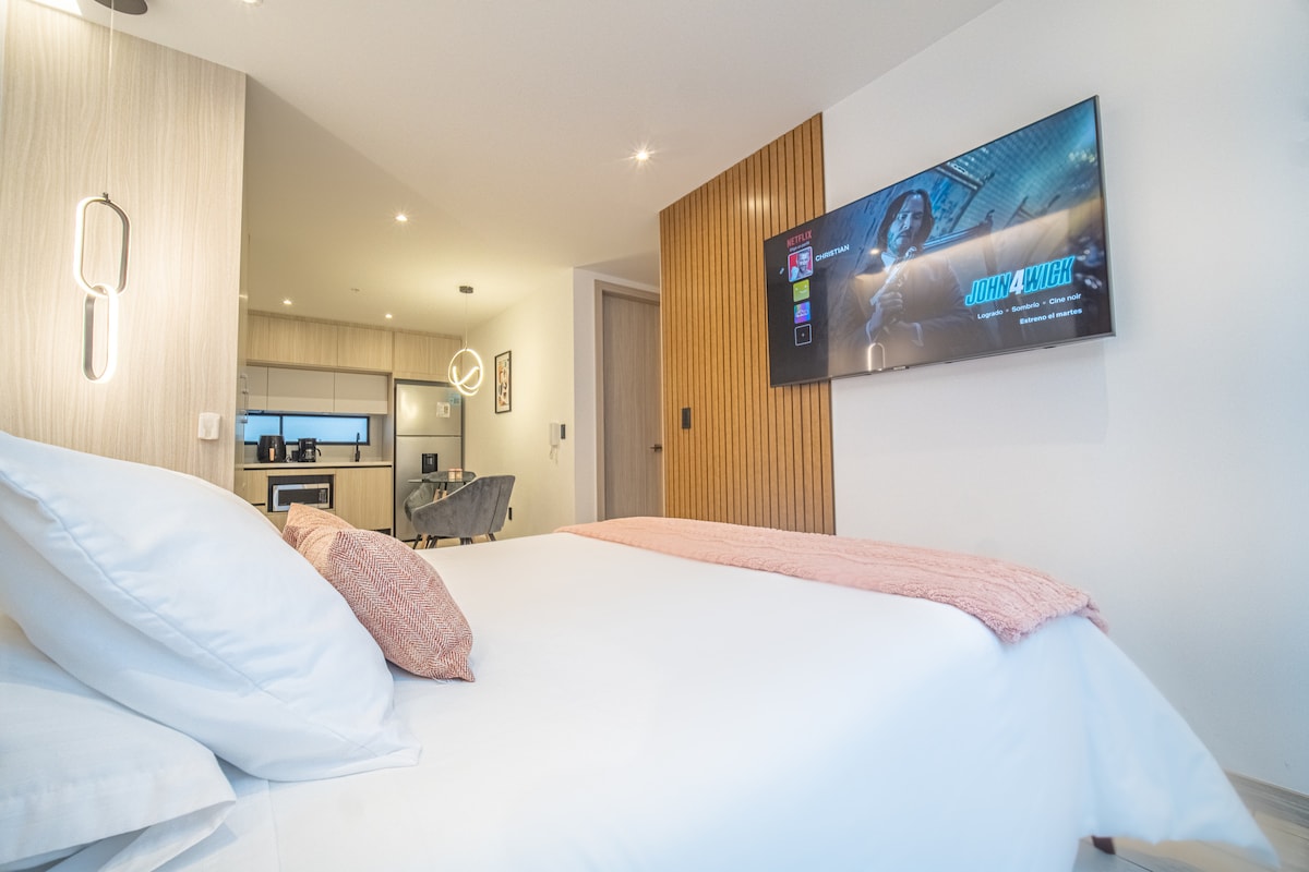 Minimalista y con todo lo necesario para una estadía larga o de pocos días. Pensada para que nuestros huéspedes tengan todo lo necesario para una estancia placentera. Cuenta con todo lo necesario para cocinar, o si se trata de entretenimiento, un monitor 4K en la sala y otro en la habitación. Silenciosa, acogedora, íntima y apacible. Su ubicación perfecta rodeada de universidades, hoteles, restaurantes, zonas turísticas, y la terraza con hermosa vista, la convierten en un destino en sí misma.